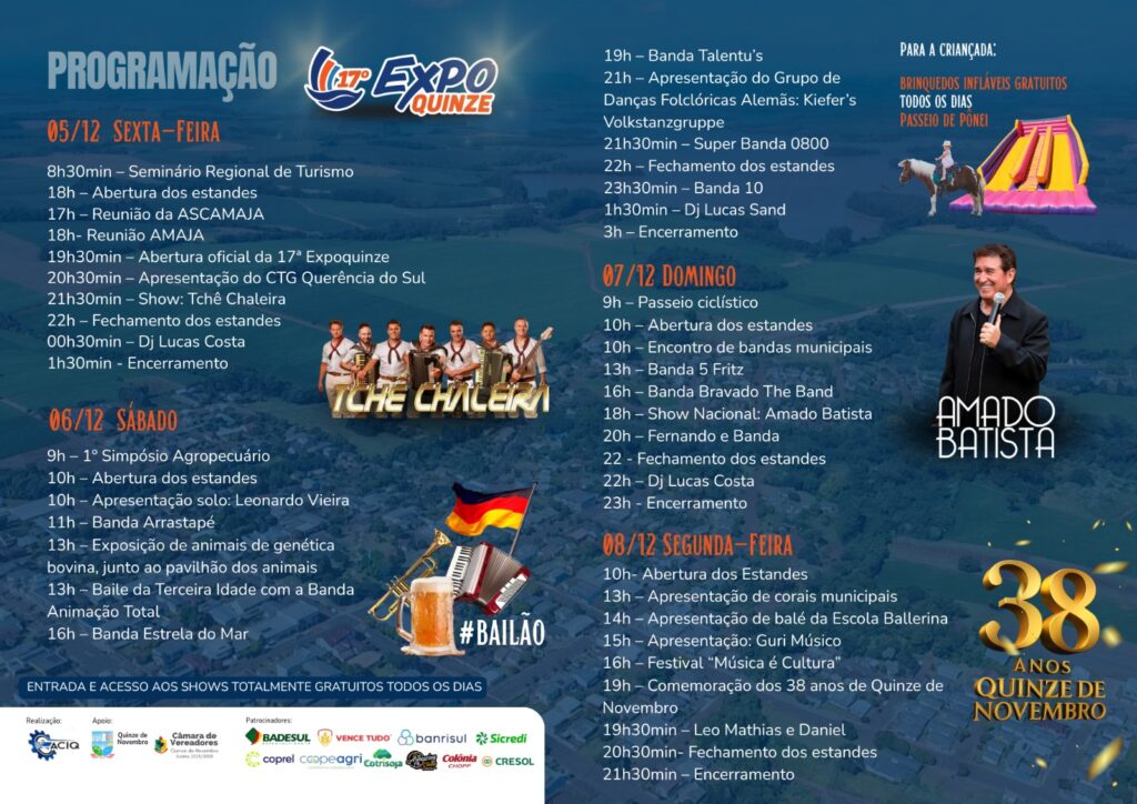 A contagem regressiva começou. Faltam 11 dias para o início da 17ª ExpoQuinze, que acontecerá a partir do dia 5 de dezembro, em Quinze de Novembro. A organização confirma que está tudo pronto para receber, com qualidade e estrutura, os visitantes de toda a região.
