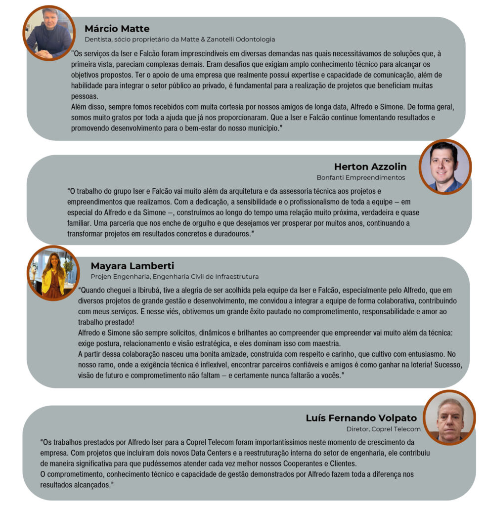 “O trabalho do grupo Iser e Falcão vai muito além da arquitetura e da assessoria técnica aos projetos e empreendimentos que realizamos. Com a dedicação, a sensibilidade e o profissionalismo de toda a equipe — em especial do Alfredo e da Simone —, construímos ao longo do tempo uma relação muito próxima, verdadeira e quase familiar. Uma parceria que nos enche de orgulho e que desejamos ver prosperar por muitos anos, continuando a transformar projetos em resultados concretos e duradouros.”