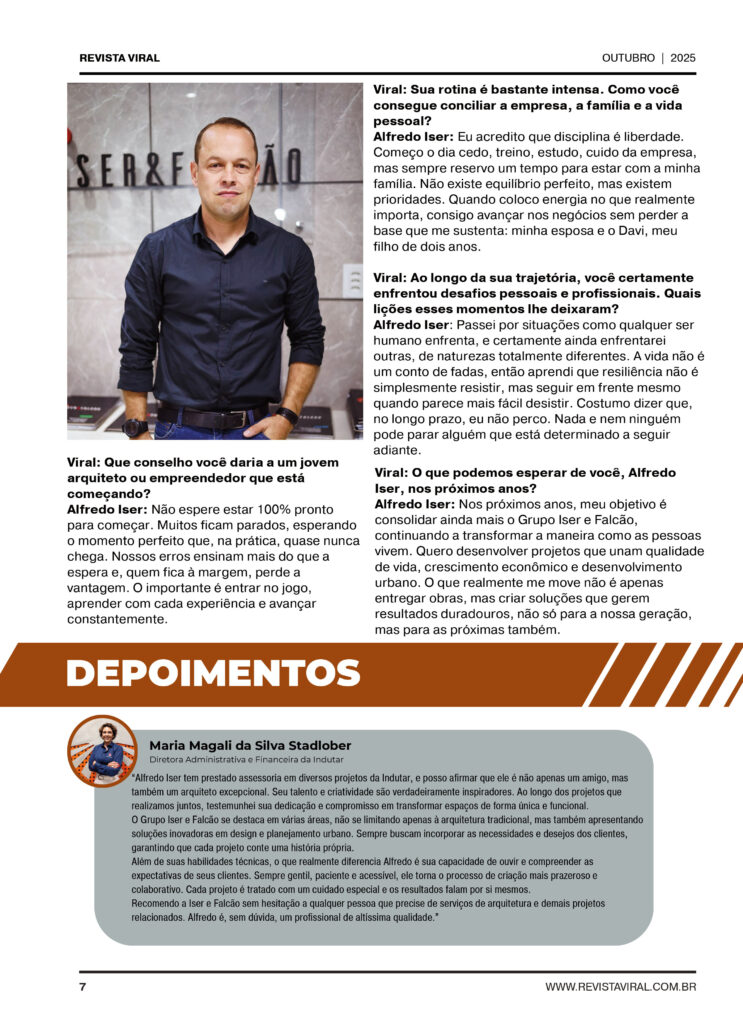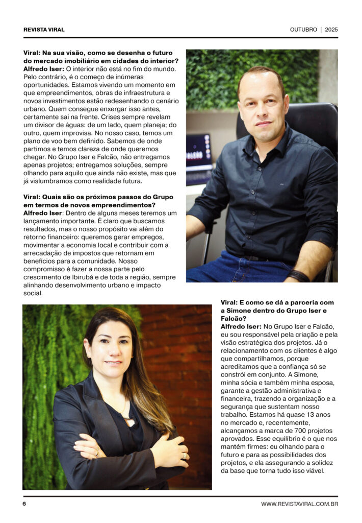 Alfredo Iser: Nos próximos anos, meu objetivo é consolidar ainda mais o Grupo Iser e Falcão, continuando a transformar a maneira como as pessoas vivem. Quero desenvolver projetos que unam qualidade de vida, crescimento econômico e desenvolvimento urbano. O que realmente me move não é apenas entregar obras, mas criar soluções que gerem resultados duradouros, não só para a nossa geração, mas para as próximas também.