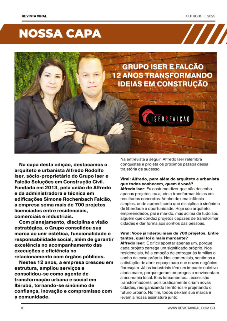 Na capa desta edição, destacamos o arquiteto e urbanista Alfredo Rodolfo Iser, sócio-proprietário do Grupo Iser e Falcão Soluções em Construção Civil. Fundada em 2013, pela união de Alfredo e da administradora e técnica em edificações Simone Rochenbachi Falcão, a empresa soma mais de 700 projetos licenciados entre residenciais, comerciais e industriais.