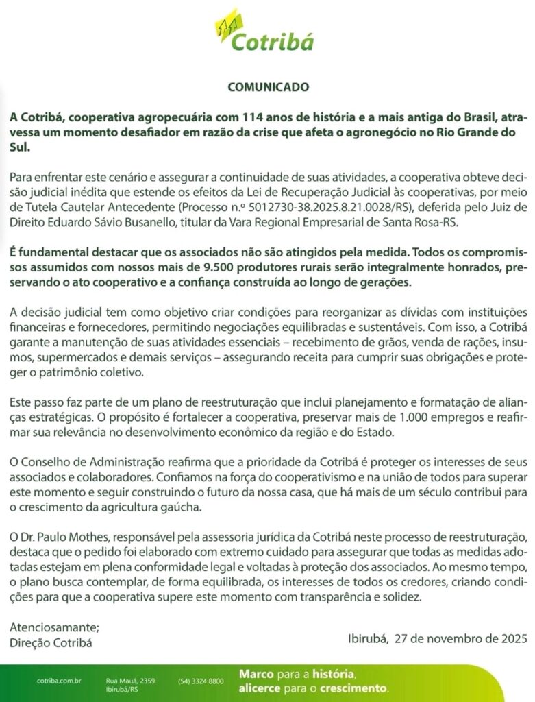 A Cotribá, cooperativa agropecuária mais antiga do Brasil, divulgou nesta quinta-feira (27) um comunicado oficial anunciando que atravessa um momento financeiro delicado devido à crise que atinge o agronegócio no Rio Grande do Sul. Para enfrentar a situação e garantir a continuidade de suas atividades, a cooperativa conseguiu uma decisão judicial inédita que autoriza a aplicação dos efeitos da Lei de Recuperação Judicial às cooperativas, por meio de uma tutela cautelar antecedente. A decisão foi concedida pelo juiz Eduardo Sávio Busanello, da Vara Regional Empresarial de Santa Rosa.