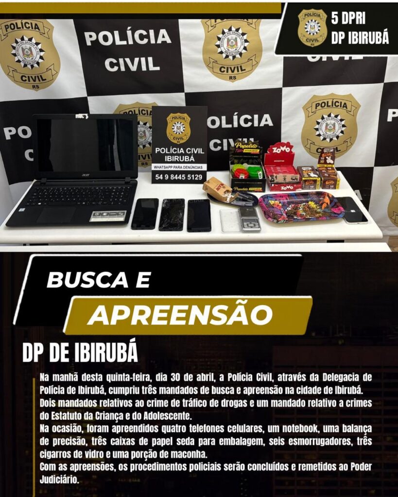 Na manhã desta quinta-feira, 30 de abril, a Polícia Civil, por meio da Delegacia de Polícia de Ibirubá, realizou o cumprimento de três mandados de busca e apreensão no município. As ordens judiciais estão relacionadas a investigações envolvendo o crime de tráfico de drogas, além de um mandado vinculado a ocorrências previstas no Estatuto da Criança e do Adolescente.